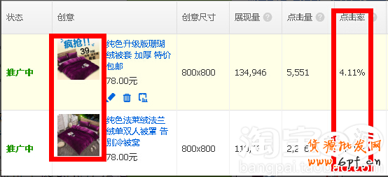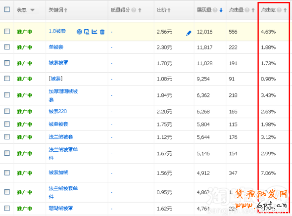以關(guān)鍵詞“ 法蘭絨被套”為例 ,可發(fā)現(xiàn)影響點擊率幾個要點: