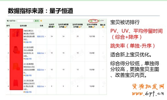 在量子恒道中,有一項(xiàng)“寶貝被訪排行”的功能,我們可以在這里獲取我們需要的數(shù)據(jù)。對于剛上架不久且零銷量的寶貝,建議選取的數(shù)據(jù)維度:PV、UV、平均停留時(shí)間,這些數(shù)據(jù)維度都是“往上走”的,帶有降序性質(zhì);最后還要單獨(dú)分析寶貝的跳失率。如果某款寶貝的總分值較低,而跳失率得分較高,說明這款寶貝的內(nèi)頁需要進(jìn)行重點(diǎn)優(yōu)化。
