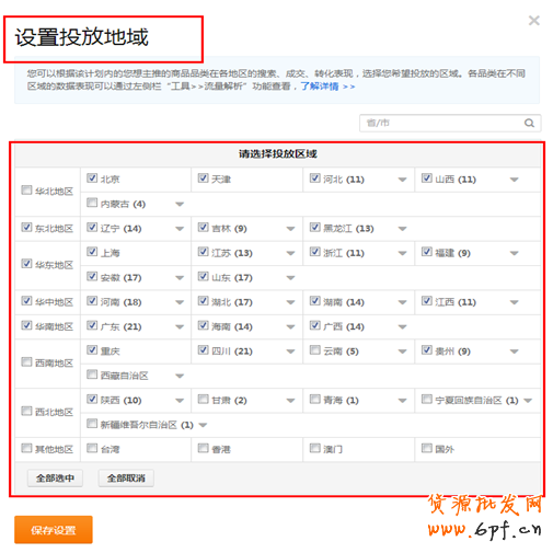 登陸直通車(chē),找到產(chǎn)品所屬的推廣計(jì)劃,設(shè)置投放地域,只投放挑選出這幾個(gè)地域(不要忘了自己所在的省份打開(kāi),否則你看不到自己的產(chǎn)品),其他地方全部關(guān)閉,見(jiàn)下圖: