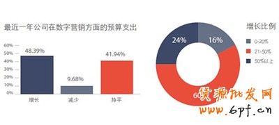 通過調研,我們可以看到,目前品牌對在數字營銷上增加預算的態度分為兩種:激進VS審慎。有24%的品牌表示,數字營銷預算增長了50%以上。部分品牌更以非常激進的姿態增加了自身在數字營銷的預算比例。5%的受訪品牌表示,過去一年里他們用于數字營銷的預算增長了100%,極端例子甚至表示他們在數字營銷預算上的費用增長了10倍。而超過60%的品牌這一增加比例在20%-50%之間,較為穩定審慎。