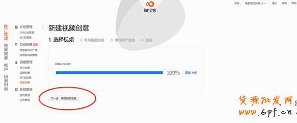 6. 新建視頻創意(上傳完成):視頻上傳完成即顯示100%,選擇『下一步,填寫視頻信息』