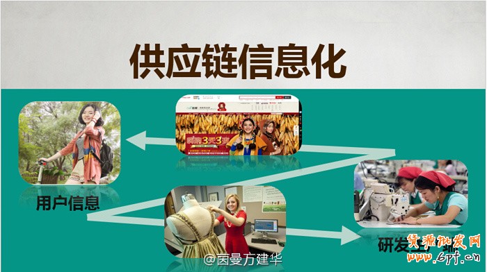 第三,解決怎么做。我們要如何做,在做的過程中和消費者如何發生關聯。供應鏈的信息化是否可以解決快速供應鏈?這個是可以的。我可以告訴大家,茵曼目前的供應鏈,T恤出貨可以做到7天,羽絨服可以做到25天,這樣的速度很快,大家覺得快和慢是否有矛盾,快不意味著東西做不好,我們茵曼專注于棉麻產品,我們的面料都在倉庫,我們供應鏈可以做出快速的反應。供應線的信息化可以解決怎么做、做怎么等一系列的問題。