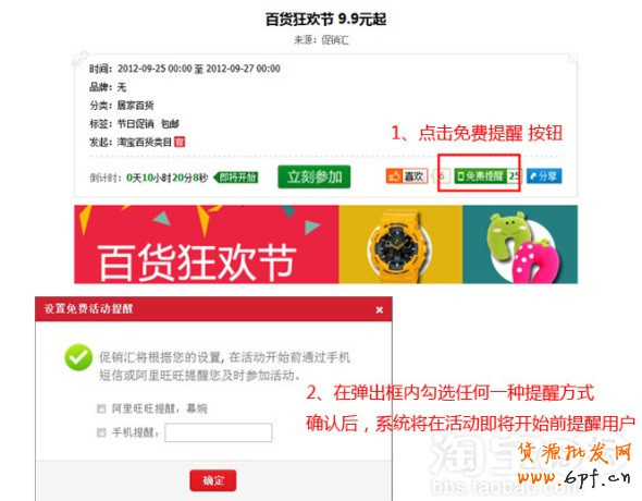 活動開始當日,系統就會通過短信、旺旺通道提醒提前告知,讓你快速進入所標記的活動頁面。
