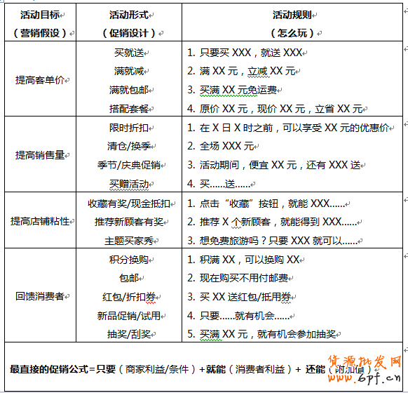 不同的活動形式能達到不同的活動目標(biāo),不同的活動在規(guī)則上也會有所不同,我們把平時經(jīng)常看到的各種促銷活動形式在下面的表中做一個統(tǒng)計和歸納,使之變得一目了然,以便大家理解和記憶。