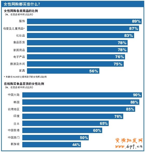 在本次調研中,亞洲女性最愛在網上購買的商品品類依次是服飾占89%;母嬰產品占87%;美妝產品占83%,還有居家產品占78%、旅游占75%等。
