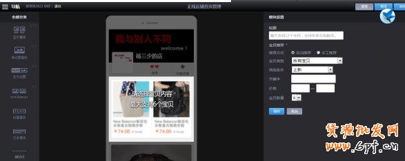 第一項(xiàng)是“寶貝模塊”。寶貝模塊相當(dāng)于pc端店鋪的“寶貝推薦”模塊。大家可以看到我們可以添加十個(gè)這樣的寶貝模塊,而且一個(gè)模塊里只能添加6個(gè)寶貝,如果10個(gè)模塊都用上,就相當(dāng)于放了60個(gè)寶貝在你家手機(jī)店鋪首頁上。我們拖動(dòng)模塊到模擬手機(jī)里看一下: