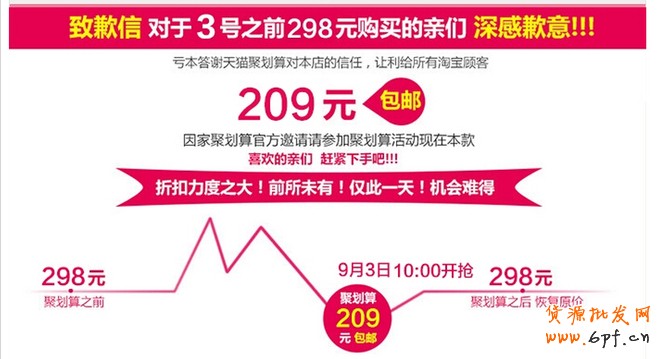 這個(gè)圖也是參加聚劃算或者單品促銷的時(shí)候最常用的圖片了,但是OSDY竟然還多了一行致歉信。若是你重視你的老顧客,為了避免傷害前幾天來購買的顧客,這樣的字眼會(huì)讓剛收到貨就發(fā)現(xiàn)降價(jià)的買家心理得到一點(diǎn)安慰,這就是品牌的魅力,用戶至上,是一個(gè)品牌持續(xù)做好服務(wù)的基本價(jià)值觀的體現(xiàn)。
