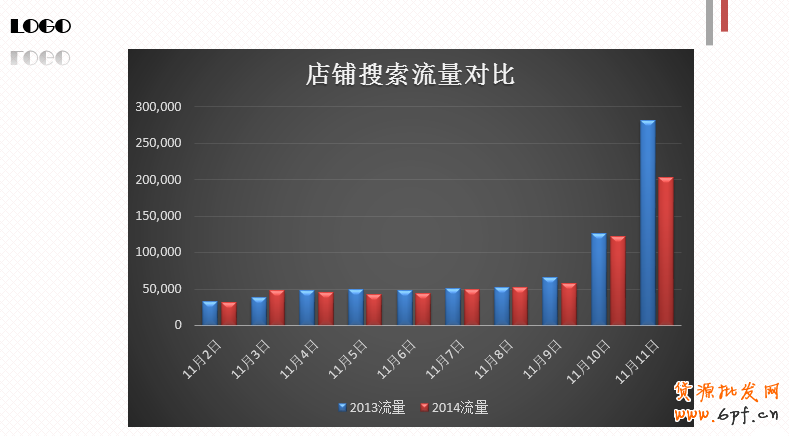 簡單歸納下:如果根據行業的數據分析,14年雙11區間流量只能達到15萬4682的流量左右。在短短的5天時間內增加了近4萬多近5萬的搜索流量,第一波的優化平均每天增長達8000多搜索流量。