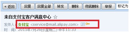 2、支付寶郵件發件人的地址末尾都是以alipay.com結尾的,且后面有黃色鎖(QQ安全標志)。