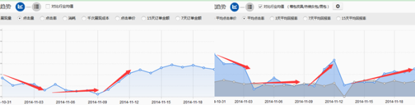 從15天訂單金額和15天展示回報率可以看出這個店鋪在訪客上轉化效果是較好的,cpc上很貼合行業的趨勢,后期因為展位的更換,cpc相對有所提高,點擊率變動上,會有所曲折,點擊率同比同期行業定向數據而言卻相對較好。