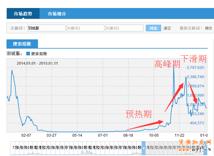 以上為2014.01月—2015.01月淘寶指數中羽絨服的行業流量;通過上圖可知,該類目從8月底行業流量逐漸上升,到10月行業需求顯著上升,11月迎來行業高峰期,11月過后行業總體呈現下滑趨勢;