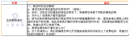 ④主動營銷話術:A.缺貨時的主動營銷B.客戶咨詢時的主動營銷C.客戶猶豫不決的主動營銷。例如: