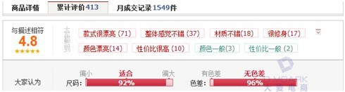對于預售寶貝,一個比較大的問題是只有銷量而沒有評價,或者寥寥無幾。這樣就無法讓買家從其他買家的評價中獲得更多關于該寶貝的信息。因此,通過預售與現貨相結合的方式,將為預售寶貝獲得一定量的評價,并且對于大品牌來說,寶貝的品質和質量都很好。這將有益于提高好評率(如圖3所示),也給以其他買家更大的信心去預購該寶貝。