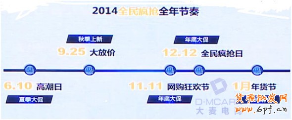 從2014年的賣家年會上,淘寶市場部總監夏季給我們預告了:2014年淘寶的兩大核心品牌活動的營銷節奏——全民瘋搶和萬能的淘寶。從下面的圖片,我們可以看到,在淘寶的全民瘋搶活動品牌下,2014年會有一系列的活動,全年共有5場大型的全網的營銷活動,其中除了6月份的夏季大促(嗨購6月),下半年還有9.25大放價·秋季上新、11.11網購狂歡節、12.12的全民瘋搶日以及年末清倉的1月臘八年貨節。