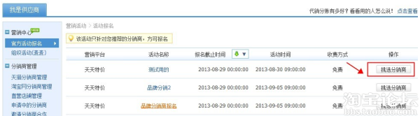供銷后臺會出現《營銷中心》的菜單項及《官方活動報名》和《組織活動(麥麥)》兩個子菜單,親需進入《官方活動報名》,即可看到天天特價報名入口。選擇自己想要參加的活動,點擊按鈕“挑選分銷商”,即可挑選分銷商報名本次活動。