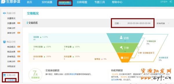 實時直播這個模塊我主要關注的是訪客的一個時間段還有入店來源入店關鍵詞等,能更好更及時的發現來訪客戶的一個特點。是無線端數據增長多些還是PC端數據增長多些,付費的來源多些還是免費的流量多些等等,現在是無線時代,個人重點關注的是無線數據這塊,還有就是免費流量這塊,大家都知道如果一個店鋪的流量付費的流量比免費的多很多的話那這個店鋪肯定有很大的問題。