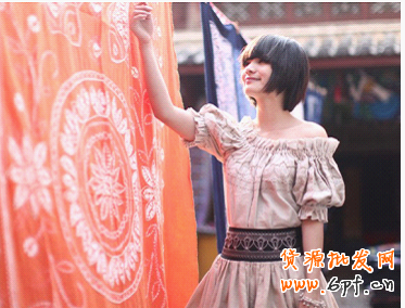 就拿下圖來說,可以很容易地判斷出這件女裝是屬于民族風,所以模特妝扮方面就以小清晰的風格來搭配衣服,在背景環境方面則是選擇一些古老的地方,更能體現出衣服的特色,也選擇蠟染布匹給襯服裝,讓整張圖片更有古美的風格,結合了這些背景和模特,這樣拍攝圖片更能體現出產品的賣點。