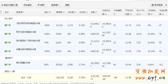 床墊在操作時(shí)以大詞為主,打開(kāi)搜索人群時(shí),直接把核心客戶(hù)比例加大,相似店鋪訪(fǎng)客和自定義人群加到一定比例,進(jìn)行引流,一段時(shí)間后,效果出來(lái),把比較突出的核心客戶(hù)群體直接開(kāi)到100%以上,在日限額控制之內(nèi)盡量的引流。大約一周到半個(gè)月之后,可以大批量的刪減一下關(guān)鍵詞,把沒(méi)有效果的關(guān)鍵詞刪除,效果比較好的提升,從而提升寶貝總體數(shù)據(jù)。