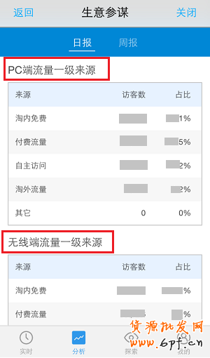 3、流量來源:淘內免費、付費流量、自主訪問、淘外流量、其他,PC端和無線端的來源分類是可以單獨查看。