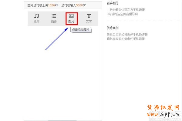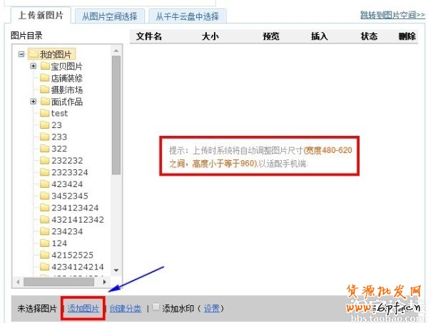 如果您是從“我要賣--發布商品”進入,點擊無線端之后選擇“添加圖片”。