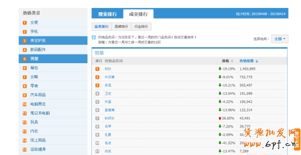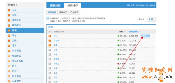 選擇你要查看的類目,就可以看到這個類目的一些熱搜詞,在實際運營店鋪中,“搜索排行”是看趨勢,更關鍵的是需要看“成交排行”!如果做男裝,點男裝類目,選擇成交排行,如下圖