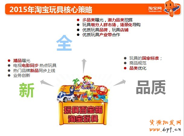 1、關于2015年淘寶玩具的核心運營策略,潤鈺也透露,今年將主打“全”、“新”、“品質”三個點。