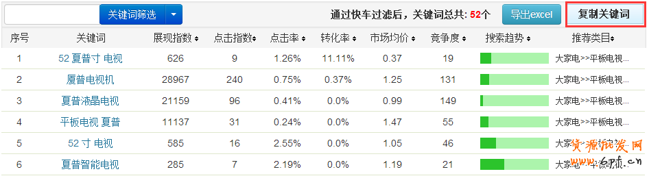 通過產品知識、標題、詳情頁等,我們可以看到,產品名稱為“電視“,品牌為”夏普“,型號為”52NX550A“,尺寸為”52英寸“,分辨率為”1080“,無”3D”,聯網方式為”無線鏈接“,無”操作系統“等等,我們可以將“電視”“夏普”“52英寸”等關鍵詞進行整理,放進快車網選詞工具里,如果下圖所示。