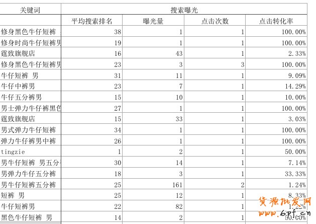 然后選擇你要作為PC核心詞的關鍵組詞,我建議是從曝光量和點擊轉化率來看篩選這個,盡量選擇平衡的。我現在自己選的一個詞為:【修身黑色牛仔短褲男】作為PC保留核心詞。