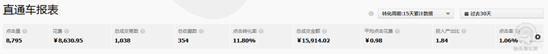 包括直通車轉化率、收藏、加入購物車、關聯營銷、詳情頁加載速度、好評&差評率、旺旺反應速度等影響購買體驗的因素。而直通車可以做到的是,轉化率、收藏、加入購物車。通過直通車報表,我們可以看出,賬戶轉化率保持在15.0%左右,平均點擊轉戶率11.80%;收藏量保持在20左右。