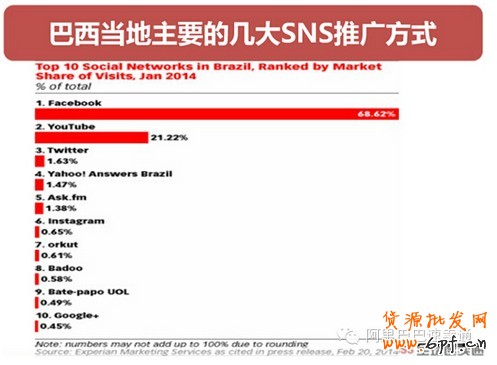 從圖中可以看出,巴西人對許多社交網絡方式都有涉及,其中Facebook和Youtube占據了80%左右的市場。