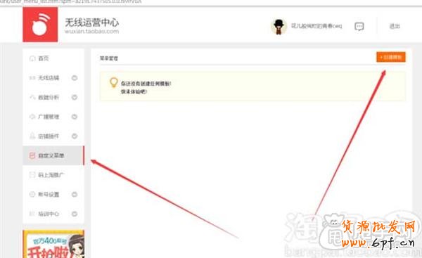 2.首先我們先來到無線運營中心http://wuxian.taobao.com,進入運營中心后,打開左側的自定義菜單,單擊右上角創建模板:
