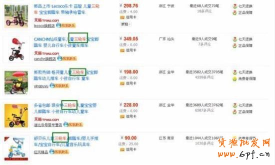 對于這種形式的關鍵詞,淘寶會認為他是一個詞,在展示搜索結果時,這個詞不管幾個字,必須完全連在一起并出現在標題中的寶貝才有被展示的機會。不連在一起的不能被提取出來,比如我們在淘寶的搜索框里面搜索“三輪車”這個關鍵詞:
