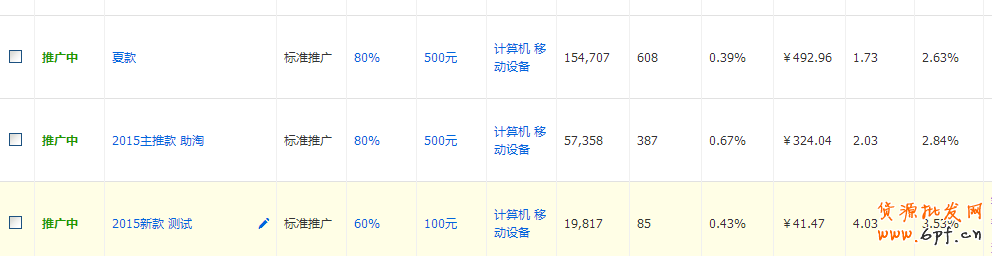 每個計劃都有專門的分配作用,4個計劃時,主要是進行春款 夏款 新款進行推廣,根據不同的賬戶分配不同的計劃,主要運用了三個計劃來推廣。如圖:三個計劃分別推廣不同的寶貝,主推款還是測試款或者夏款等,根據自己的實際情況來合理安排推廣計劃。