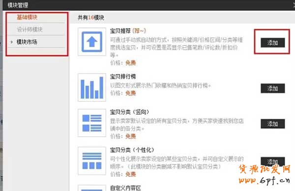 2.在模塊管理中的基礎模塊里選擇自己需要的模塊,點擊“添加”,模塊管理中有三個部分,分別是:基礎模塊、設計師模塊、模塊市場,模塊市場中的模塊是需要錢的,而基礎模塊就是免費的。