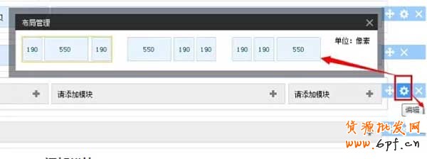 如果我們添加了一個三欄的框架,想更換頁面尺寸設置時,可以點擊頁面“編輯”按鈕,重新選擇就可以了,在這里大家需要注意的,假如在添加布局單元時是選擇了三欄的,在編輯時,是不能修改為一欄和兩欄的,除非你是刪除掉然后重新布局,假如添加的是一欄布局單元的,這里就不會出現“編輯”的圖標的,只會有“刪除”和“移動”這兩個圖標,并且,網店裝修頁中部分最多只可以添加五個布局單元框架。