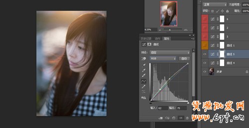 4、這一步,我們通過曲線降低高光區的,暗部則繼續加強,具體而言,紅綠曲線提高,藍調曲線降低,這樣字,色彩會更加的豐富。