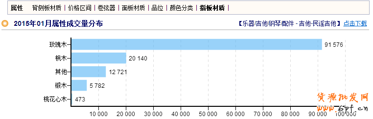從生意經中,吉他這個類目屬性成交量分布,可以看到背側板的材質為椴木的成交分布量是最高的,面板的材質為云衫木的成交分布量是最高的,其次是椴木,而指板的材質為玫瑰木的成交分布量是最高的,所以在吉他制作材質選擇的時候,背側板、面板、指板的材質以成交量最高的來進行選擇。