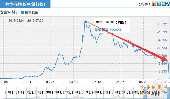 由于小編所代理的賬戶的主推產品是女童涼鞋,所以上圖截取的是“女童涼鞋”和“兒童涼鞋”的行業趨勢圖,從圖中我們可以看出,行業是在4月底開始逐步下滑的,下滑趨勢較為明顯。