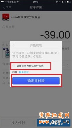 B、頁面彈出花唄介紹頁面,點擊【確定并付款】,若用戶有開通默認付款方式,則提醒開通花唄為默認支付方式
