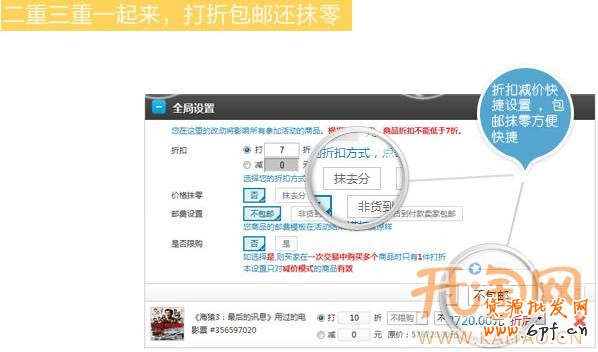 口碑最好的淘寶營銷軟件!任意折扣限時打折(完美支持7折以下)、節日促銷、包郵、部分滿就送,活動時間隨意設定不限時長。1分鐘上手!更有微博營銷、專區推廣等特色功能,幫您增加流量、提升營銷效果。