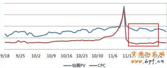 從2013年鉆展數據來看,余熱期的流量恢復到雙11前的水平,但還是維持在比較高的水平,說明雙11的熱度還在延續。cpc降低到10月初的水平,可以用較低的成本拿到流量;從CPM和ROI來說,由于流量競爭下降,競價成本大大降低,另外投產比持續上升,回復到9月底的水平。
