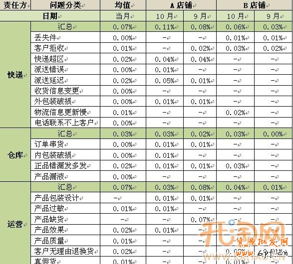 從表中可以分析出,因為快遞問題導致的退貨率越來越高,需要加強快遞公司的管理;10月份因為審單原因造成的“贈品錯漏發”比例很高,甚至出現了0.11%這個高比例;“運營問題”在A、B兩店鋪均有所改善;“客戶無理由退貨”比例較高;因為倉庫原因導致的“正品錯漏發”比例明顯提高,損失比較嚴重。