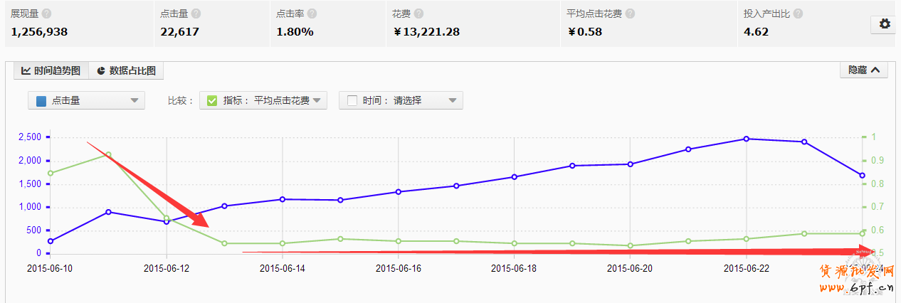 Ppc經過幾天的波動之后就一直穩定并且是低于行業市場平均出價的,無線端的流量在穩定上升,占比最多,主要的操作是避開pc端關鍵詞的競爭,加大無線端推廣測試;引入更多的無線端流量進行測試效果反饋,在關鍵詞的質量得分普遍比較高的情況下,拉低時間折扣的同時加大無線端和站外的投放力度,控制pc端的流量同時,加大無線端流量促進轉化,拉低整體的ppc,提高點擊率,引進更多的流量。