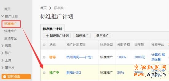 在左側的導航欄中點擊推廣計劃,在彈出的下拉框中點擊標準推廣,然后在標準推廣中找到你要操作的推廣計劃點擊打開。