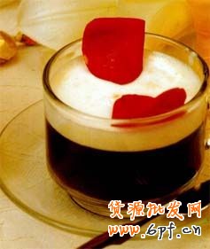 法國(guó)人對(duì)紅酒的鐘愛猶勝與俄羅斯人對(duì)伏特加,巴西人對(duì)咖啡。他們不愿意紅酒攙雜任何別的物質(zhì)。Burgundy Coffee卻是一種將紅酒與咖啡融合在一起的花式咖啡。我在想這種咖啡應(yīng)該是愛浪漫的法國(guó)人設(shè)計(jì)的,因?yàn)樗闹谱鬟^程中充滿了紅色的爛漫。先將鮮奶油與紅酒攪拌一下,然后打沫,打出來后你會(huì)發(fā)現(xiàn)紅色的奶沫是那么別有韻味,含蓄卻又充滿了挑逗。在已暖完杯后的馬克杯底先加入一點(diǎn)紅酒,然后將做好的咖啡與砂糖到入(咖啡是意式濃縮咖啡),最后將打好的紅色泡沫放入。一杯浪漫的Burgundy咖啡就做成了。