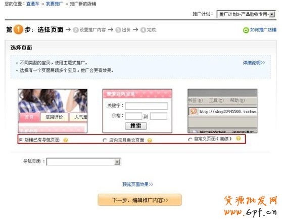 推廣的頁面可以選擇店鋪中已有的導(dǎo)航頁面(只有首頁和自定義頁面會被同步)。當(dāng)買家點擊店鋪推廣的展現(xiàn)信息就會跳轉(zhuǎn)到這個設(shè)置了的店鋪頁面。