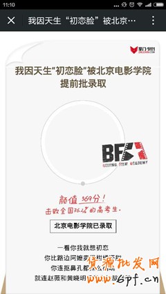 “測試顏值”這款游戲從頭到尾都在“挑逗”受眾的情緒。一個理想的應用場景是,高考放榜前夕,某個考生在刷朋友圈時看到好友發出一條消息——我因顏值爆表被北京大學錄取。這時,他首先產生的情緒是“好奇”,點開頁面之后,會看到好友的自拍照和顏值分數,這時產生的情緒可能是“搞笑”。如果好友顏值是670分,打敗全國70%的考生,考生可能會產生“攀比”心理——要不我也試一下?得分高的話,他可以發朋友圈炫耀一下,游戲進入下一輪傳播;如果是低分,那也可以重新上傳照片,再嘗試一遍。即使依舊低分,那分享給好友們自黑下也無妨。