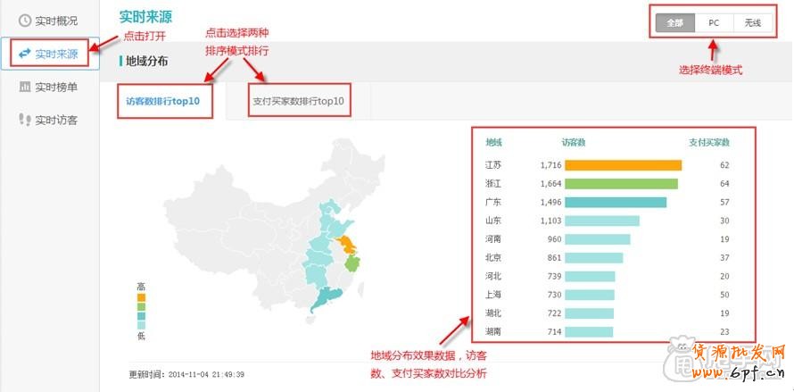 實(shí)時(shí)來(lái)源主要提供店鋪實(shí)時(shí)訪客地域分布、實(shí)時(shí)流量來(lái)源分布,分訪客數(shù)和下單買家數(shù)讓你了解到店鋪實(shí)時(shí)訪客top10地域分布,分PC端無(wú)線端讓你了解到店鋪細(xì)分實(shí)時(shí)來(lái)源效果,實(shí)時(shí)了解當(dāng)前店鋪流量來(lái)源現(xiàn)狀,及時(shí)調(diào)整引流策略。