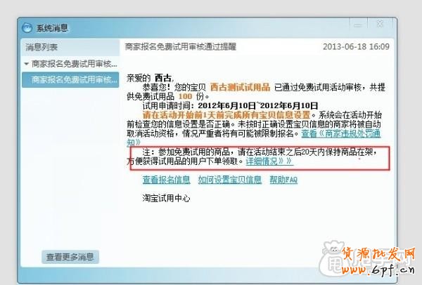參加淘寶試用活動的商品報名審核通過后,請淘寶試用賣家注意查看旺旺系統彈窗,如圖:.