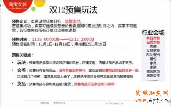 預售時間11.25 0:00:00——12.122:00:00,預售只有會場商品,沒有外圍沒有黑馬,預售商品無法參加雙12會場。